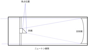 この反射系構造故焦点位置が光路の途中に発生しますのでニュートン式では光路の途中に斜鏡を入れて光路の外に出す構造です 当然斜鏡が主鏡の光路の一部を遮蔽してしまいます。