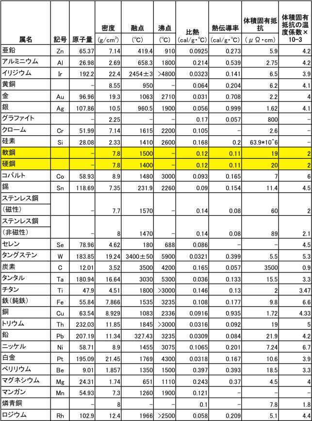 下記に代表的な金属導体の特性表を示します 比較単位として1cm角の試験片の抵抗値を示しています。