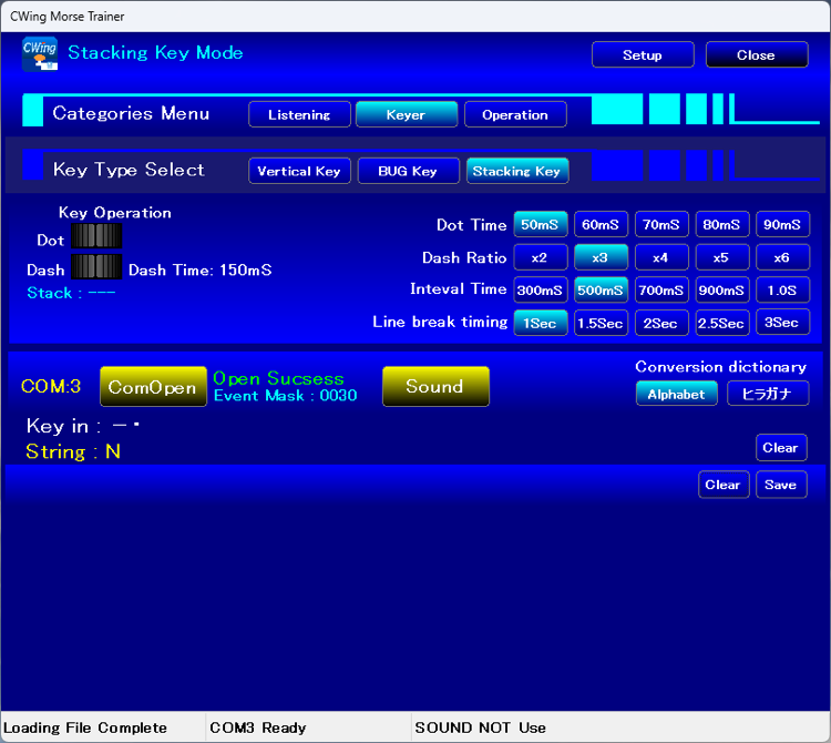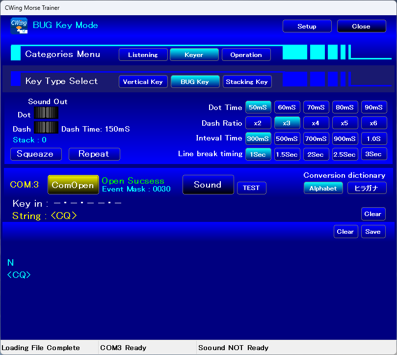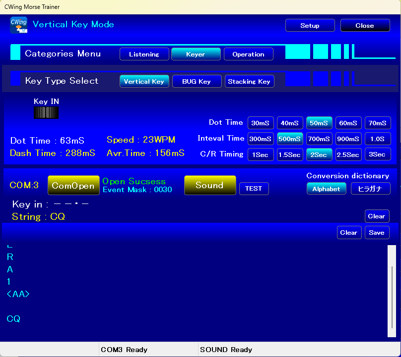 縦振り電鍵の練習コーナーで打ち込み速度や短点/長点の長さ(時間)の計測