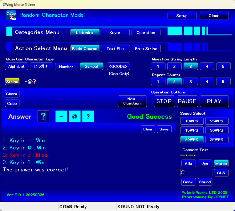 [Talking Mode]:モールス音の後に音声で読み上げる聞き込み演習モードです。